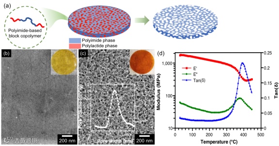 图2. 聚酰亚胺薄膜的制备和性能。(a)基于聚酰亚胺嵌段共聚物制备介孔薄膜:选择性热分解聚乳酸相产生介孔。(b)热分解聚乳酸相前,前驱体薄膜表现为平滑表面,(c)热分解聚乳酸相产生平均孔径为21纳米的介孔。插图展示了薄膜热分解前后的颜色变化,圆形薄膜直径为19毫米。(d)介孔聚酰亚胺薄膜室温下具有1.80 GPa的高储存模量。