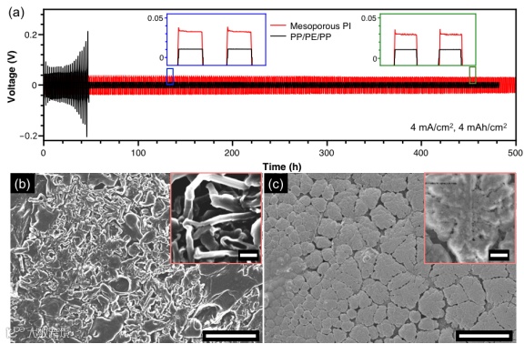 图3. 长时间锂/锂电池循环测试及锂电极形貌。(a)装备传统隔膜的电池在约50小时循环后发生短路,而装备介孔聚酰亚胺薄膜的电池安全循环达500小时。循环测试后,(b)接触传统隔膜的锂电极表面生长出宽度为200 纳米的锂枝晶,而(c)接触介孔聚酰亚胺薄膜的锂电极表现出平顶锂突出形貌。(b)与(c)中比例尺为5微米,插图中比例尺为500纳米。