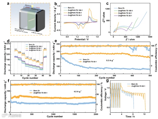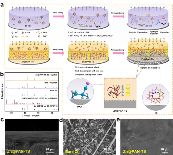 华北理工大学的朱靖&戴磊&何章兴教授利用有机材料聚丙烯腈(PAN)和无机材料钛硅分子筛(TS),构建了有机/无机复合人工界面层(Zn@PAN-TS)来保护锌负极。PAN中的氰基与锌离子具有配位效应,有利于锌离子的传输。多孔的TS可通过离子限域效应调节锌离子的通量。因此,PAN-TS有机/无机人工保护层提供了快速有序的离子传输通道,通过双重效应协同调控锌的均匀沉积。这项研究为开发水系锌离子电池中的无枝晶锌负极提供了启示。