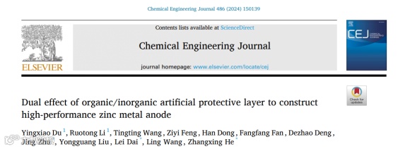 其成果以题为“Dual effect of organic/inorganic artificial protective layer to construct high-performance zinc metal anode”在国际知名期刊Chemical Engineering Journal上发表。本文第一作者为华北理工大学硕士研究生杜英晓。