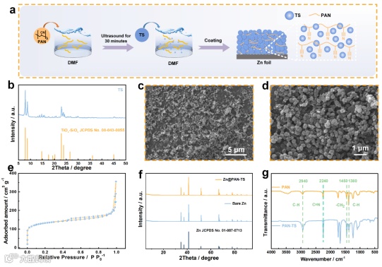 聚丙烯腈(PAN)对锌离子电镀/剥离引起的体积变化具有良好的柔韧性和适应性,在AZIBs中具有较好的应用潜力。而且,PAN含有氰基官能团,氰基与锌离子之间的强配位有助于锌离子的传输。无机材料具有良好的耐腐蚀性、稳定的结构和良好的热稳定性。作为无机材料的一种,钛硅分子筛(TS)不仅具有上述优良特性,还具有高比表面积和多孔结构。因此,构建了PAN-TS复合人工保护层对锌负极进行改性(Zn@PAN-TS),PAN-TS复合人工保护层同时具有PAN和TS材料的优点。