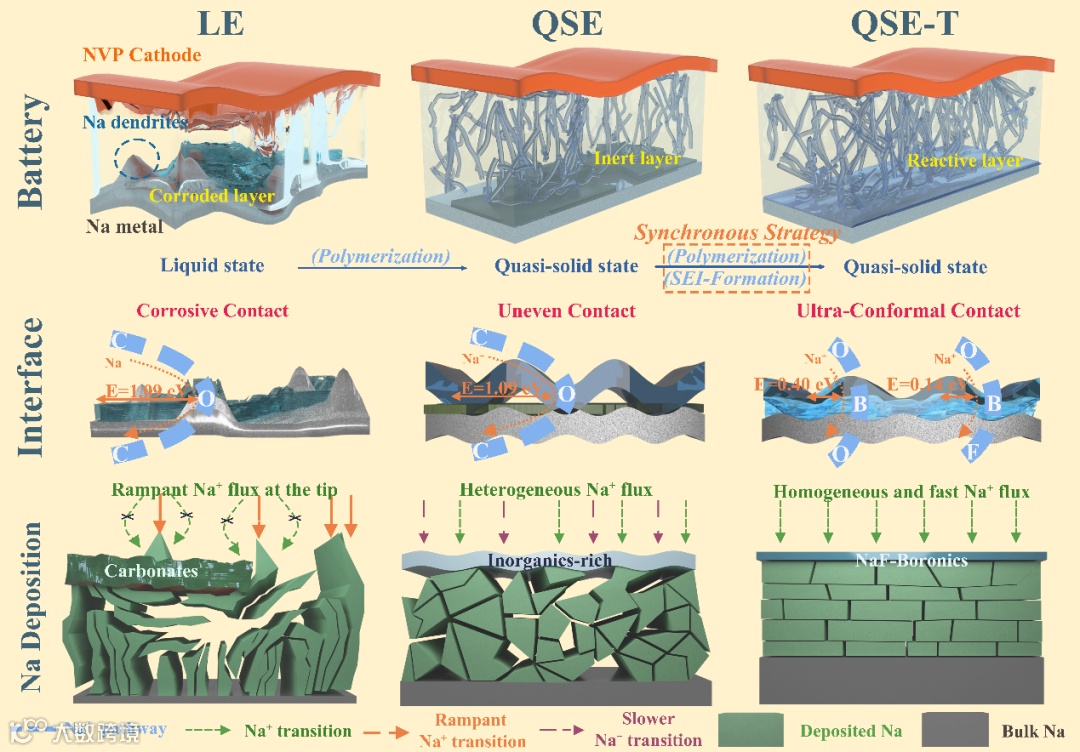 钠金属电池具有较高的理论比容量(1166 mAh g−1)和低氧化还原电位(-2.71 V),是下一代二次电池的有力竞争者。然而,在钠金属电池中,高活性金属钠与液体电解质之间的严重副反应易诱发不良的界面腐蚀,从而导致钠枝晶的生长不受控制、库仑效率(CE)低,甚至引发安全问题。而聚合物类固态电解质相比传统的液态电解液具有更好的热稳定性/氧化稳定性,且成本较低,因此被认为是非常有吸引力的下一代电解质材料。但其界面层中含有大量低流动性、高离子扩散势垒的无机化合物,易导致刚性的固态电解质-电极界面存在物理接触损失,使得其动力学受影响。