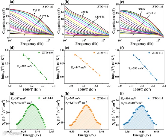 Figure 5. Temperature-dependent admittance results for the representative ZTO-1:0, ZTO-4:1 and ZTO-1:1 photovoltaic devices. (a-c) C-f-T spectra, (d-f) the Arrhenius plots for defect activation energy Ea calculation, (g-i) the obtained defect activation energies and defect densities.