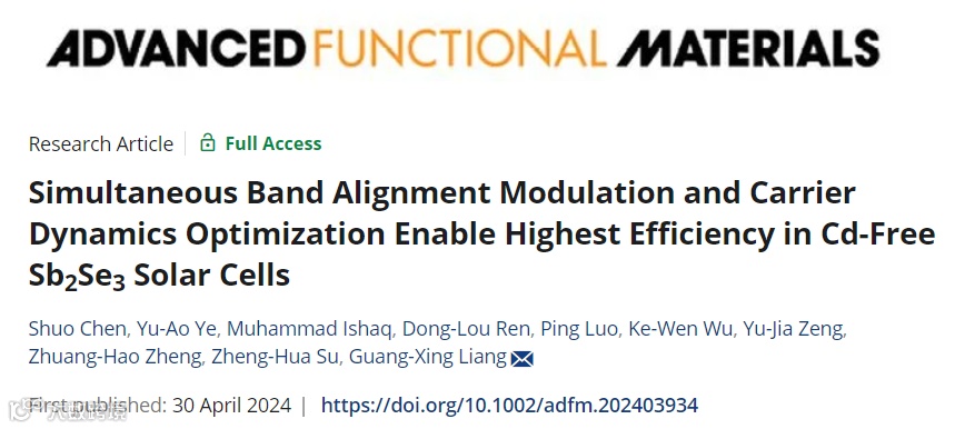 近日,深圳大学梁广兴研究员和陈烁副教授在高水平学术期刊Advanced Functional Materials上发表题为“Simultaneous Band Alignment Modulation and Carrier Dynamics Optimization Enable Highest Efficiency in Cd-Free Sb2Se3Solar Cells”的研究论文。该文章针对目前硒化锑(Sb2Se3)薄膜太阳电池中电子传输层(ETL)具有生物毒性或存在异质结能带匹配不理想的问题,设计引入原子层沉积(ALD)法制备的锌锡氧化物(ZTO)作为ETL,成功研制出高效无镉Sb2Se3薄膜太阳电池。