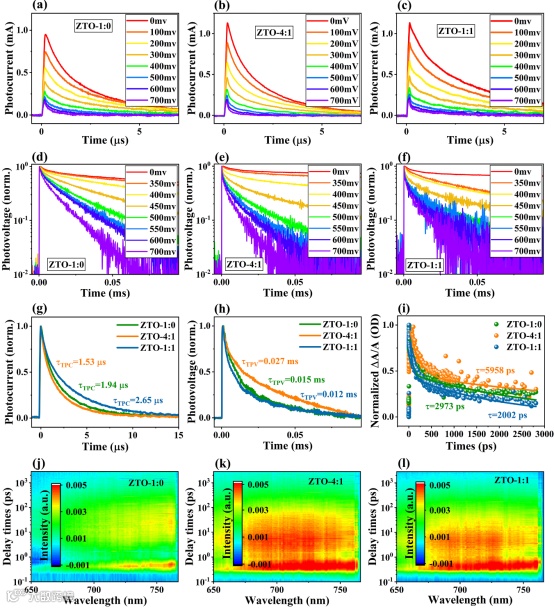 Figure 6. Carrier dynamics analysis. (a-c) TPC and (d-f) TPV curves of the representative ZTO-1:0, ZTO-4:1 and ZTO-1:1 photovoltaic devices measured at different bias voltages. (g) The derived TPC decay lifetime (τTPC), and (h) TPV decay lifetime (τTPV) under 0 V bias. (i) Transient kinetic traces showing the decay lifetime for different Sb2Se3/ZTO film samples. (j-l) TAS color mappings of the corresponding ZTO-1:0, ZTO-4:1, and ZTO-1:1 samples, respectively.
