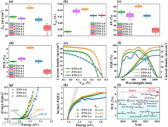 Figure 1. (a-d) JSC, VOC, FF and PCE for five groups of Sb2Se3/ZTO photovoltaic devices with different Zn/Sn ratios. (e) J-V plots of the representative ZTO-1:0, ZTO-4:1 and ZTO-1:1 champion devices. (f) EQE and integrated JSC of the corresponding devices. (g) Bandgap of the Sb2Se3absorber layer derived from the EQE data. (h) Urbach energy derived from the EQE data. (i) Summary and comparison of the PCEs of state-of-the-art Cd-free Sb2Se3thin-film solar cells reported in recent years, revealing a record value belonging to this work.