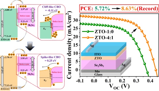 在本工作中,研究发现具有适当Zn/Sn比例的 ZTO ETL 可以将Sb2Se3/ZTO异质结带排列调制为理想的“尖峰状”排列,不仅能抑制电荷载流子在界面上的积聚和复合,同时有效增强载流子输运。此外,由于在ALD过程中形成钝化的Sb2O3超薄层,可进一步抑制Sb2Se3体内载流子复合,从而提高载流子寿命、抽取效率和收集效率。基于此,研制的Mo/Sb2Se3/ZTO/ITO/Ag薄膜太阳电池的光电转换效率高达8.63%,代表目前无镉Sb2Se3薄膜太阳电池的最高效率。本工作提出的ETL界面工程可为环境友好型硫系薄膜太阳电池的进一步发展提供重要的研究基础。