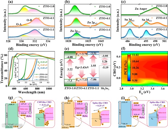 Figure 2. XPS spectra of O 1s (a), Zn 2p (b) and Sn 3d (c) for the representative ZTO-1:0, ZTO-4:1 and ZTO-1:1 films. (d) Transmittance spectra of the representative ZTO films, as well as Tauc plots of (αhν)2 versus photo energy (hν) (inset). (e) Schematic representation of EC, EV and Eg of ZTO ETLs and Sb2Se3absorber. (f) Effect of Eg (i.e., for ZTO) and CBO on device PCE via SCAPS simulation. Schematic illustration of the Sb2Se3/ZTO heterojunction band alignment and the corresponding carrier transport/recombination behaviors inside ZTO-1:0 (g), ZTO-4:1 (h), and ZTO-1:1 (i) samples.