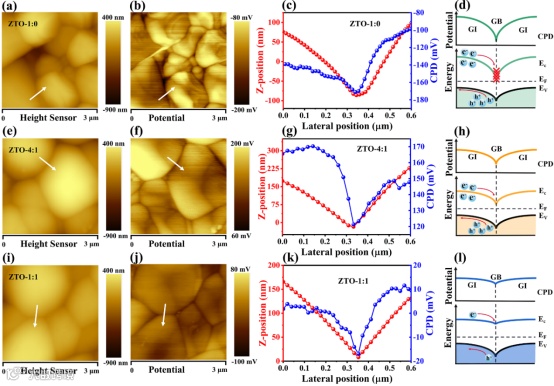 Figure 3. KPFM scanning surface topography and CPD maps for Sb2Se3/SnOx laminate films, corresponding to ZTO-1:0 (a, b), ZTO-4:1 (e, f), and ZTO-1:1 (i, j), respectively. (c, g, k) The corresponding topography and potential line scans obtained from the white arrow lines. (d, h, l) Schematic diagrams of the energy band structure and CPD near the GBs, wherein, “e−” represents electron; “h+” represents hole.