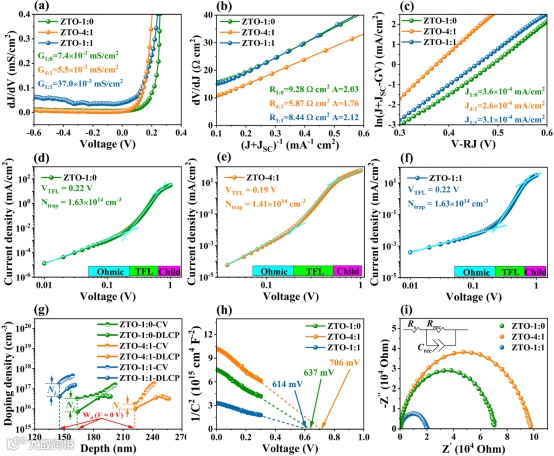 Figure 4. Electrical and electrochemical analysis of the representative ZTO-1:0, ZTO-4:1 and ZTO-1:1 photovoltaic devices. (a) Shunt conductance G characterizations, (b) Series resistance R and ideality factor A characterizations, (c) Reverse saturation current density J0 characterizations, (d–f) Logarithmic J–V curves, (g) C–V and DLCP profiles, (h) 1/C2-V plots, and (i) Nyquist plots with an equivalent circuit diagram.