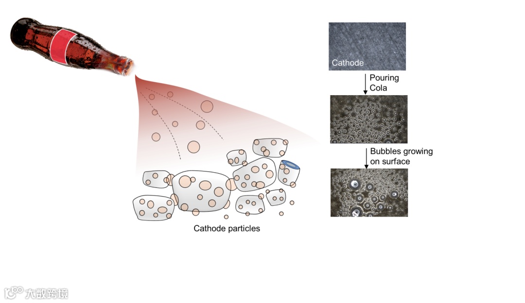 科学研究的灵感有时来源于生活。众所周知,可乐是一种风靡全球的碳酸饮料。在压力作用下,过量的二氧化碳气体溶解在水中,形成过饱和的二氧化碳溶液。在日常生活中,一个有趣的现象引起了人们的注意:在可乐中插入一根纸吸管,或者在可乐中放入一片曼妥思,都会加剧气泡,导致溢出。根据 Scriven 的模型,过饱和溶液中二氧化碳气泡的生长速度与界面特性有关。粗糙的界面可为 CO2 提供更多的成核点,甚至在微观结构中形成连续的 CO2膜。这一点恰好解释了纸吸管或曼妥思会加剧起泡的现象。那么在可乐体系中,用正极材料取代吸管/曼妥思会如何呢?