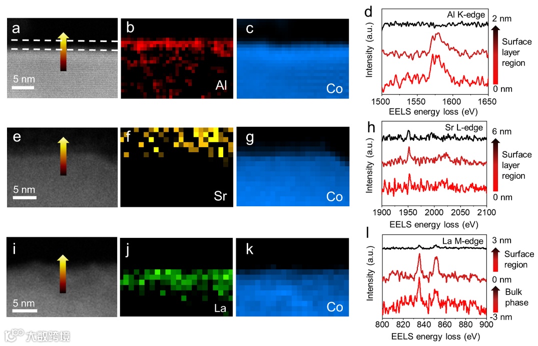 图3. 其他元素均匀掺杂方法的扩展。(a-d)Al元素修饰的EELS映射及谱图;(e-h)Sr元素修饰的EELS映射及谱图;(i-l)La元素修饰的EELS映射及谱图。