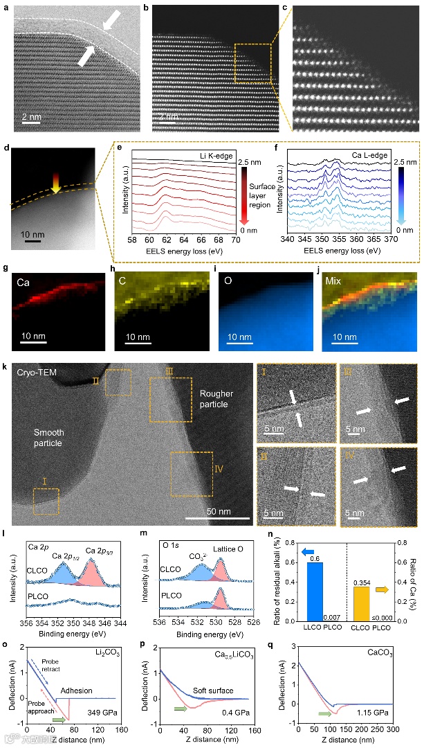 图2. 碳酸盐化的正极表面结构。(a-c)STEM-ABF以及STEM-HADDF;(d-f)表面EELS线扫;(g-j)EELS mapping 元素分布;(k)cryo-TEM图像;(l-m)XPS谱图;(n)电化学滴定及ICP测试结果;(o-q)AFM力曲线。