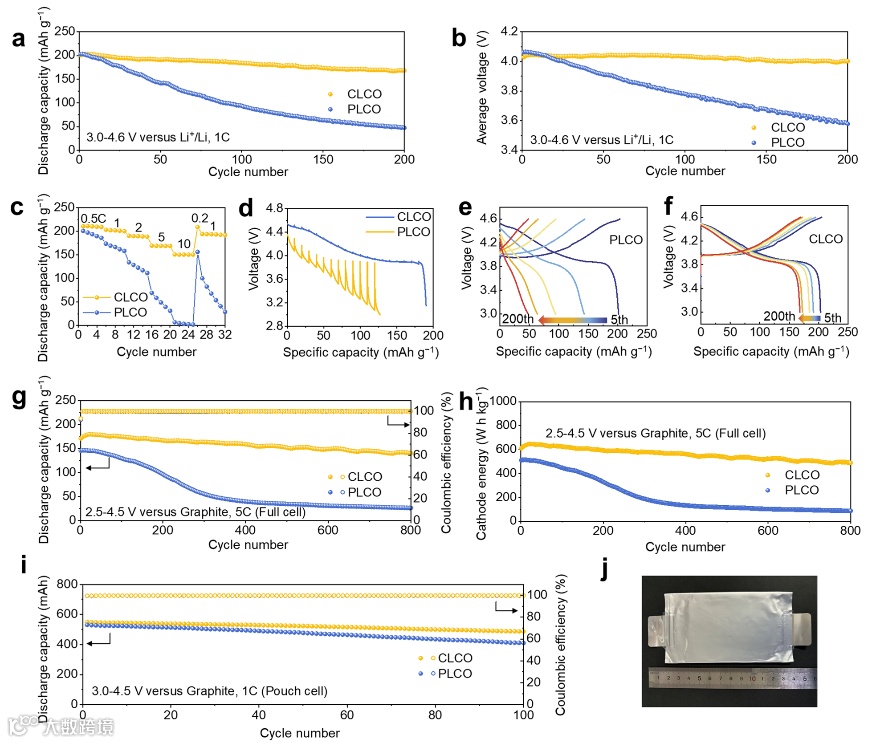 图5. 扩展用于修饰高电压钴酸锂的电化学性能。(a-f)扣式半电池电化学性能;(g-h)扣式全电池电化学性能;(i-j)软包全电池性能。