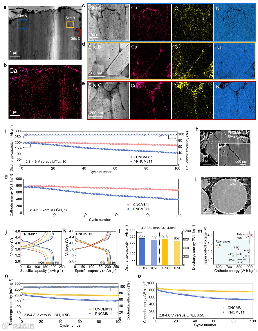 图4. CO2渗透及封装NCM811晶界实现4.6 V和4.8 V下的稳定。(a-e)修饰后的NCM811晶界处元素映射;(f-g)4.6V电化学性能;(h-i)循环后SEM;(j-o)4.8V电化学性能。