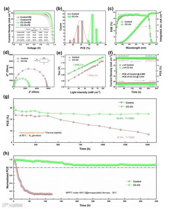 以三元环生物碱秋水仙碱作为添加剂的钙钛矿太阳能电池,研究了其光伏性能和稳定性。无反溶剂制备的钙钛矿太阳能电池成功获得了25.06%的最高效率。此外,基于Ch的未封装的器件在氮气环境、85℃下放置1500小时仍然保持初始PCE的83.6%;封装器件在连续AM1.5G照明下进行MPP跟踪,450小时后仍保持归一化初始PCE的87.6%,表现出良好的稳定性。