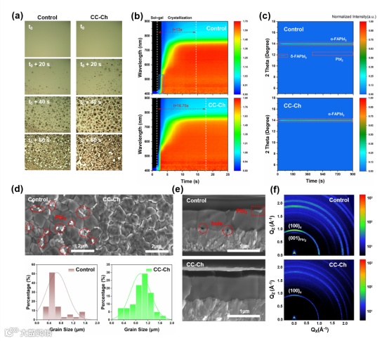 图4. 秋水仙碱催化结晶α-FAPbI3钙钛矿薄膜过程的表征。
