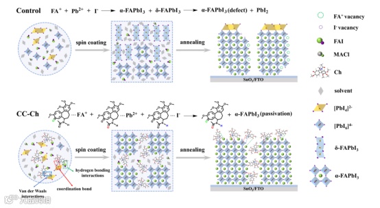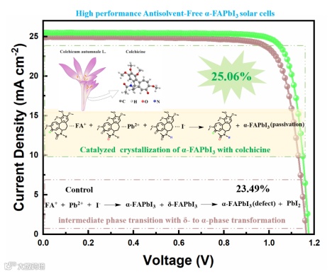 图1. 将三元环生物碱秋水仙碱应用于高质量α-FAPbI3钙钛矿薄膜的催化结晶过程,采用一步法无反溶剂工艺生产高性能钙钛矿太阳能电池。