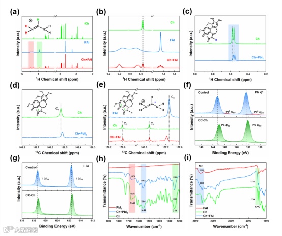 该工作中,作者通过理论计算模拟和实验表征表明,Ch的加入改变了钙钛矿前驱体溶液中PbI2和FAI之间的相互作用,Ch(-CONH-)和Pb2+之间形成了强烈的配位相互作用,Ch(C=O)和FA+之间形成了氢键,以及Ch(-NH-)和I-之间形成了氢键。这写作用起到调节钙钛矿薄膜成核结晶过程,同时有望在薄膜中减少未配位的Pb2+和卤素缺陷,提升了钙钛矿薄膜的质量。