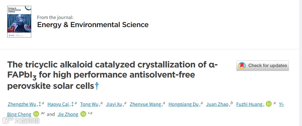 Wu Z, Cai H, Wu T, et al. The tricyclic alkaloid catalyzed crystallization of α-FAPbI3for high performance antisolvent-free perovskite solar cells [J]. Energy Environ Sci, 2024.