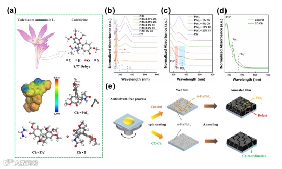 近日,来自武汉理工大学的钟杰教授,在国际知名期刊Energy & Environmental Science 上发表题为“The tricyclic alkaloid catalyzed crystallization of α-FAPbI3for high performance antisolvent-free perovskite solar cells”的文章。该文章提出了一种α-FAPbI3钙钛矿的催化结晶策略,利用三元环生物碱添加剂秋水仙碱(Ch)来获得高性能的无反溶剂钙钛矿太阳能电池。Ch和钙钛矿之间的相互作用及原位分析表明,Ch三元环上的不同官能团与钙钛矿前驱体溶液存在特异性结合,与常规路线中生成δ-FAPbI3和其他中间相相比,Ch 催化了α-FAPbI3的直接形成。此外,Ch分子原位钝化晶界,并显著减少了催化结晶过程中产生的缺陷。因此,钙钛矿太阳能电池的效率高达25.06%,未封装器件在85℃下超过1500小时仍能保持初始效率的83.6%,在最大功率点跟踪 450 小时后仍能保持初始效率的 87.6%。