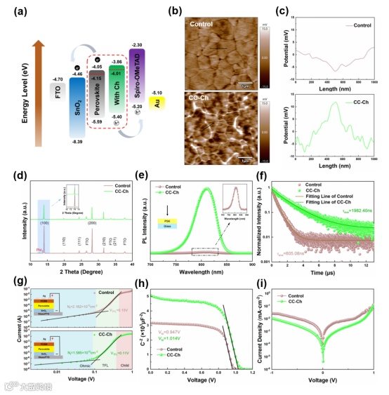 残留的秋水仙碱存在于钙钛矿的晶界处,钝化晶界,降低薄膜缺陷。通过UPS、XRD、PL、TRPL、SCLC等一系列表征,说明了Ch的存在能提高钙钛矿薄膜中载流子的传输速率和输运时间,有效抑制了深层缺陷引起的非辐射复合,同时改善了能级对准,有利于钙钛矿到HTL的空穴提取和传输,从而提高器件性能。