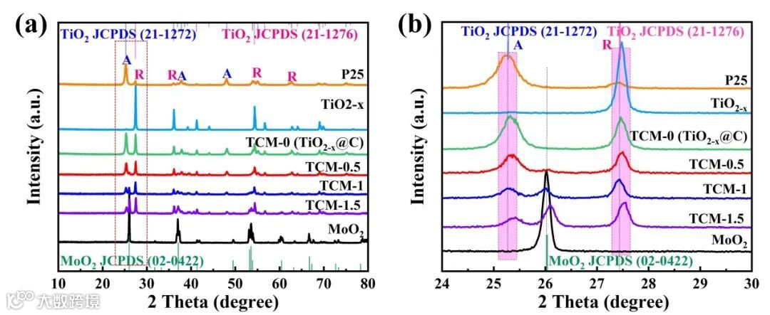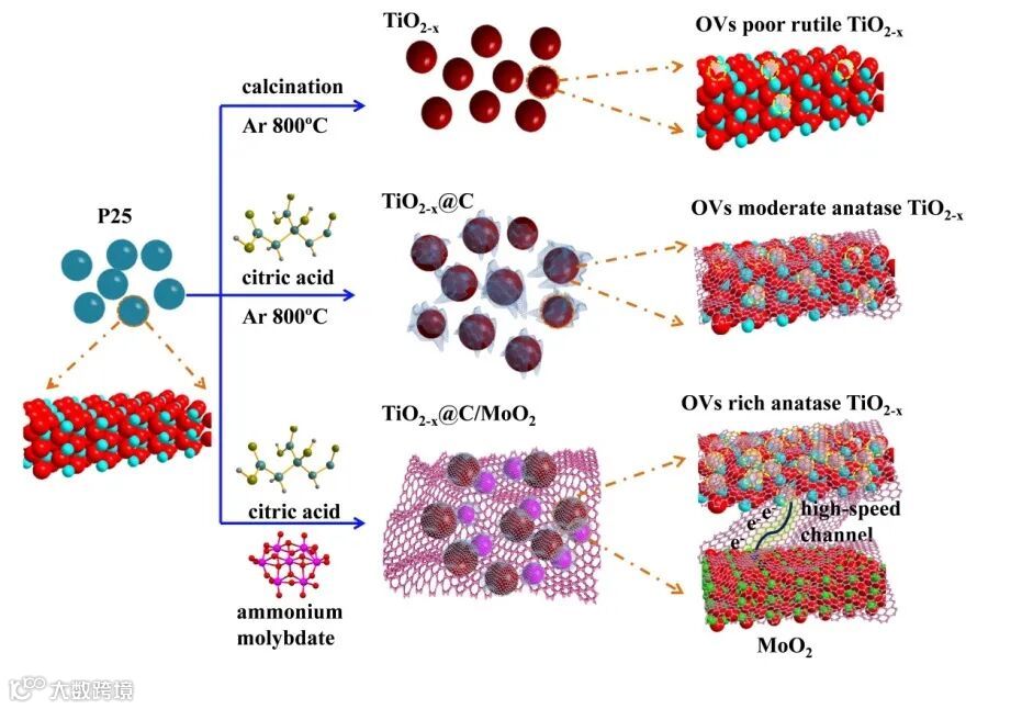 以P25粉末、柠檬酸和七钼酸铵为原料,在Ar气氛中800°C退火2小时,改变柠檬酸和钼酸铵的质量实现氧空位浓度和MoO2含量的调控。此处,柠檬酸分子在TiO2-x@C/MoO2肖特基结生成中起关键作用:抑制TiO2从锐钛矿向金红石的相变,提高OVs浓度,产生金属MoO2。此外,柠檬酸原位热分解产生的碳不仅可以作为电荷载流子分离的导电通道,还可以保护内部材料以提高稳定性。