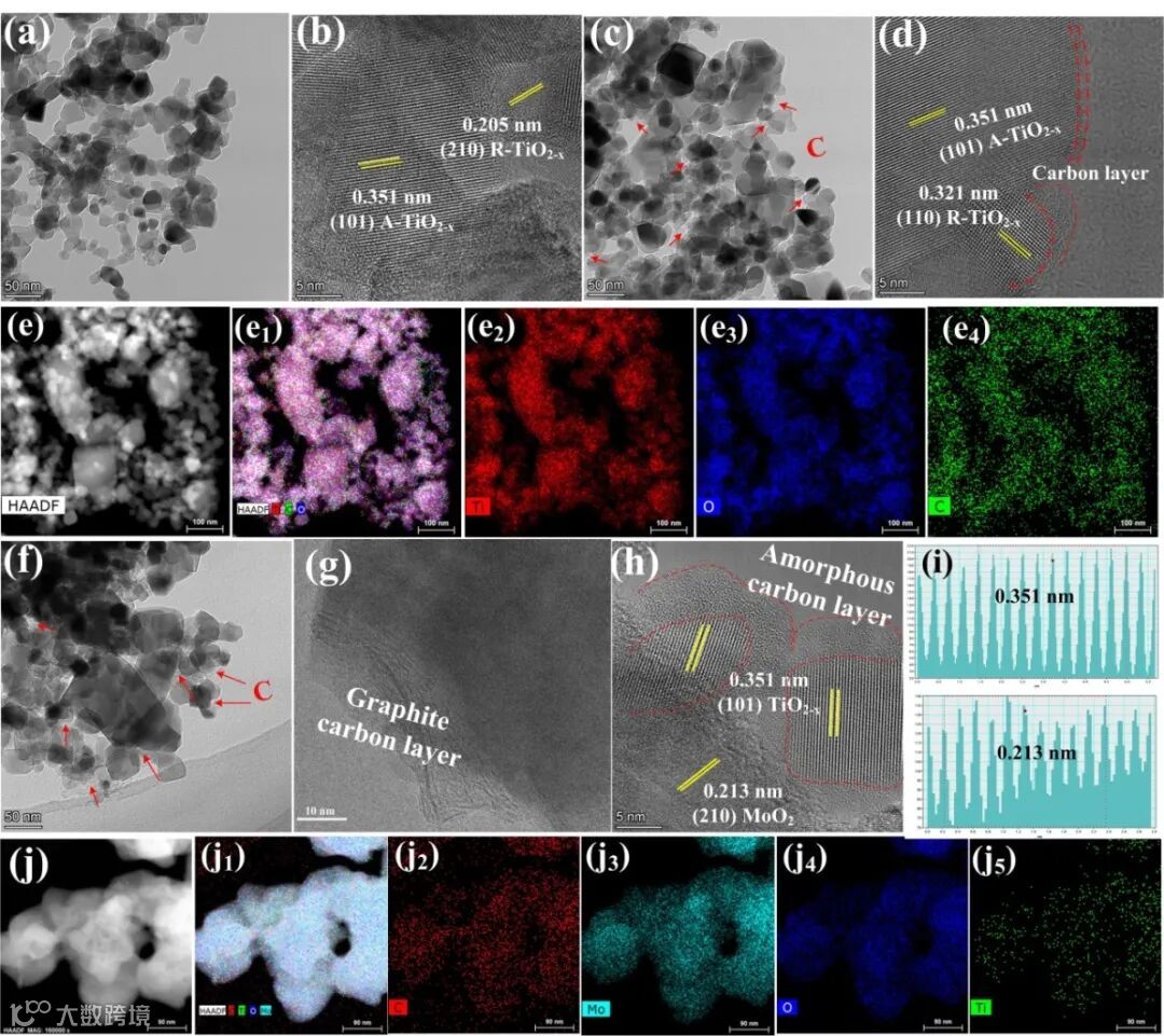 XRD图谱证明了柠檬酸在原位相变策略中不可或缺的作用。在没有柠檬酸的情况下,由于高温下的相变,锐钛矿TiO2完全转变为金红石相,加入柠檬酸可以抑制TiO2从锐钛矿向金红石的相变。此外,柠檬酸在MoO2纳米颗粒的形成中起着至关重要的作用。没有柠檬酸时钼酸铵分解成Mo4O11和MoO2,引入柠檬酸时可获得金属MoO2。因此,柠檬酸不仅可以抑制锐钛矿-金红石TiO2的相变,而且有利于形成还原性的MoO2并诱导产生更多的氧空位。