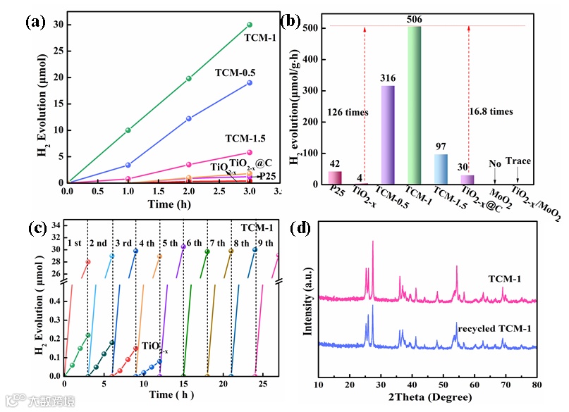 在模拟太阳光源下对样品的光催化活性进行了评估和比较。由于电子和空穴的快速复合,TiO2-x样品几乎没有显示出析氢活性,纯MoO2也不能产生H2。与TiO2-x样品相比,所有TCM样品的析氢活性都显著增强,TCM-1达到了506 μmol•g–1•h-1的最高值,是TiO2-x样品的126倍和16.8倍,这一结果表明,导电碳层和MoO2都有助于促进载流子分离和光催化性能。此外,由于机械混合TiO2-x/MoO2物中,TiO2-x和MoO2之间的较差电子转移,只有痕量的析氢速率,进一步表明了碳材料在不同组分之间的关键作用。TCM-1样品在循环测试期间显示出几乎相同的H2产生性能,而TiO2-x表现出降解产氢速率,说明碳层可以保护氧空位。循环样品的XRD图谱表明具有高的结构稳定性。