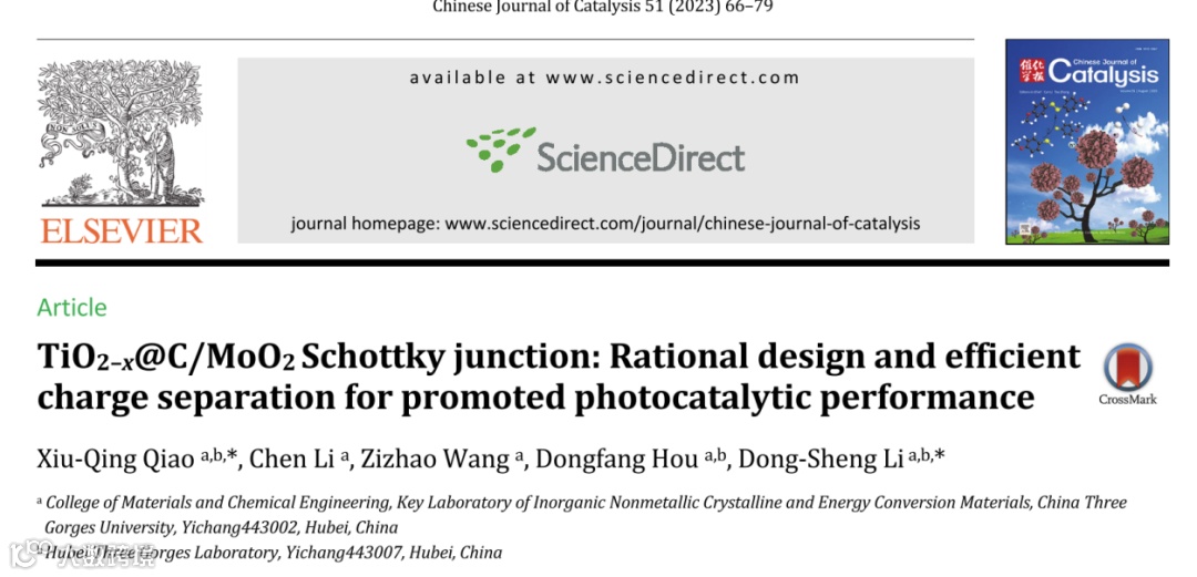 Xiu-Qing Qiao, Chen Li, Zizhao Wang, Dongfang Hou, Dong-Sheng Li. TiO2–x@C/MoO2Schottky junction: Rational design and efficient charge separation for promoted photocatalytic performance, Chinese Journal of Catalysis 51 (2023) 66–79.