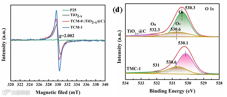 化石能源短缺与环境污染问题的日益突出,使得开发清洁可再生能源成为世界各国共同追逐的目标。氢能具有燃烧比热高、燃烧产物绿色无污染,来源丰富等优点被认为是理想的新能源。光催化产氢可以直接利用太阳能分解水产生氢气,是制备氢能的重要技术之一。TiO2具有成本低、无毒、稳定等优点成为光催化领域的明星材料,但其较宽的禁带宽度使得太阳光利用率低,此外,光生电子和空穴的复合速率快,这极大的制约了TiO2光催化产氢的发展。氧空位(OV)被报道可以改善上述问题,OVs的存在是带正电的,可以吸引负电荷,从而提高局部电荷密度,并在导带(CB)以下产生新的局部态或浅施主能级,从而缩小带隙能量并增加光吸收。此外,表面OVs的存在不仅可以抑制光生电子-空穴对的复合,提高表面反应活性,而且是分子吸附和活化的良好位点。然而,由于TiO2-x中少数电子和空穴的扩散长度较短,界面电荷转移动力学受到限制,析氢反应的光活性仍然不令人满意。因此,开发高效的TiO2−x光催化剂仍然是一个巨大的挑战。