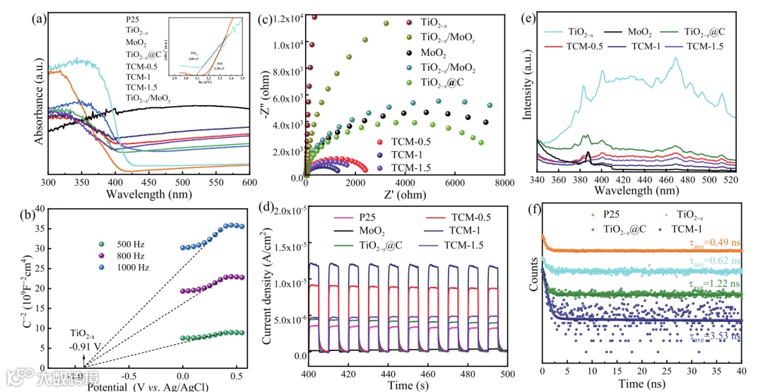 通过紫外-可见漫反射光谱法研究了样品的光吸收能力。如图所示,白色P25仅对本征宽带隙表现出紫外光吸收,而TiO2-x在吸收边缘表现出明显的红移,说明TiO2-x中的OVs可以促进可见光吸收。根据图中的Tauc图,基于Kubelka–Munk方法估计样品的带隙,P25和TiO2-x的带隙(Eg)分别为3.20和3.09eV,OVs缺陷的成功引入降低带隙。同时,由于碳层的引入和OVs的产生,TiO2-x@C的可见吸收明显增强。黑色MoO2样品在整个光谱上表现出强烈的吸收。TCM样品表现出强光吸收能,这可以极大的提升光催化活性。光电化学性能表明肖特基结中光生电荷可以实现高效分离。