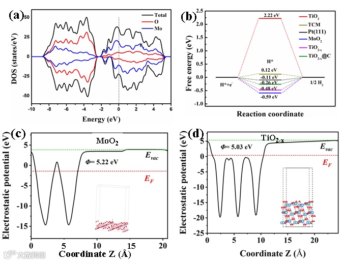 密度泛函理论(DFT)计算表明随着氧空位的引入,TiO2-x在费米能级附近出现了局域态密度,表明增加的电导率和更高的电子传输能力,穿过费米能级(Ef)的分裂波的存在证实了MoO2的金属性质,与紫外-可见吸收光谱结果一致。对于TCM,由于MoO2的金属特性,在费米能级上观察到更多的占据态。与纯TiO2样品(2.22eV)相比,TiO2-x表现出显著降低的吉布斯自由能(-0.48eV),这表明O空位的引入可以有效地促进H2在TiO2-x上缓慢离解,从而提高光催化性能。在TCM中引入碳层和MoO2助催化剂进一步将|∆GH*|降低到0.12eV,接近最佳Pt(0.11eV)。此外,功函数计算证实TiO2-x和MoO2接触时,将在界面处形成肖特基结。此外,对肖特基结进行了光催化降解抗生素实验,推测了四环素的降解路程及降解机理。