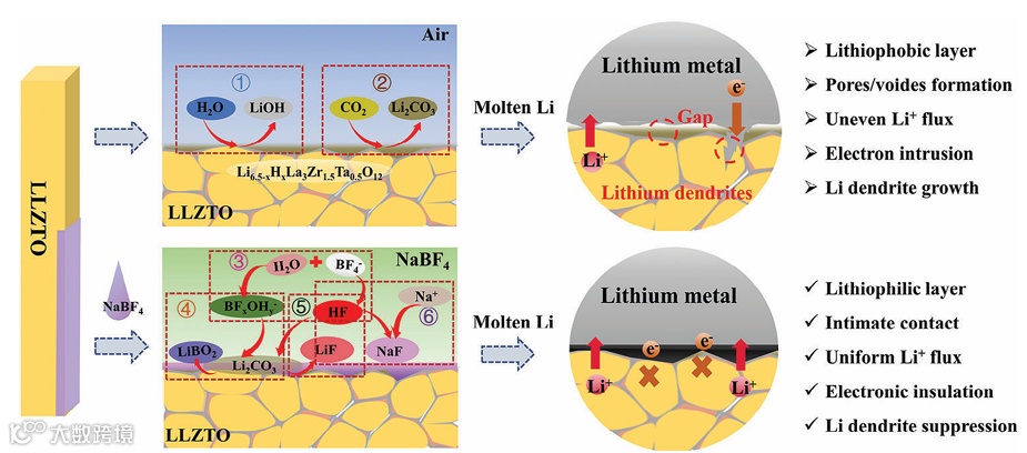 利用BF4-水解后的产生无机酸除去LLZTO表面的碳酸锂杂质,并将其转化为包含LiF、LiBO2和NaF的多功能复合层。该层不仅对锂具有良好的润湿性,并且具有高电子绝缘性的LiF和NaF可以抑制界面处的电子“入侵”电解质内部,有效抑制锂枝晶“由外向内”的生长。
