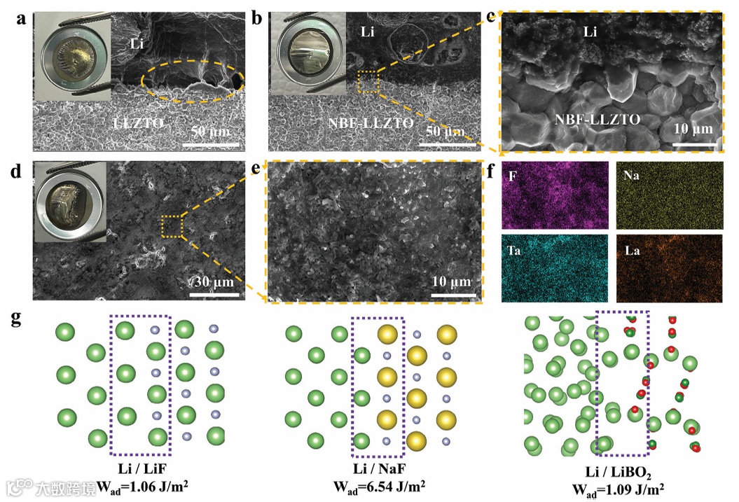 图3. LLZTO/Li和NBF-LLZTO/Li界面的SEM横截面图像,熔融锂与NBF-LLZTO反应形成的新界面的SEM图像、元素分布图以及界面粘附功的计算模型和结果。
