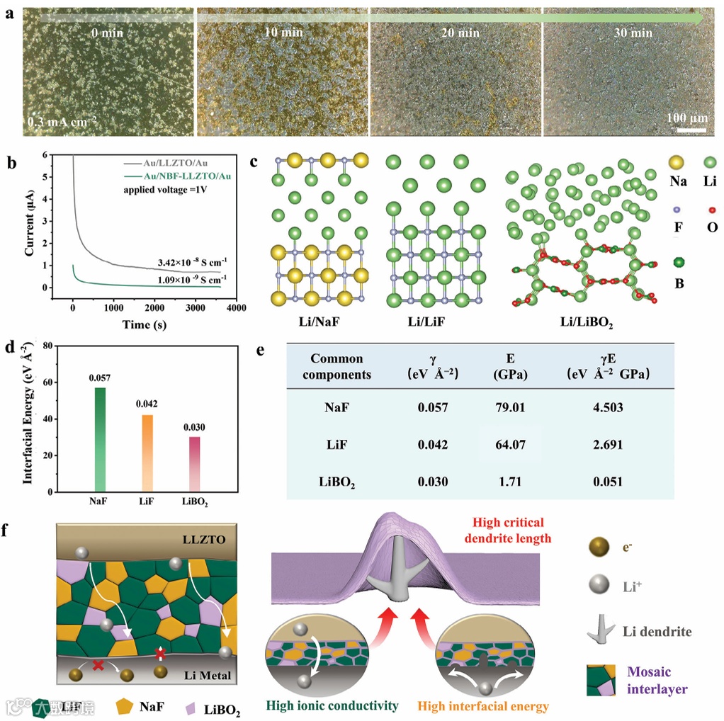 图4. 展示了锂在LLZTO表面沉积的原位光学图像、Au/LLZTO/Au和Au/NBF-LLZTO/Au的电子导电率比较、NaF、LiF和LiBO2对锂的界面结构模型、界面能、以及与锂金属相关的不同组分的γE计算结果以及NBF-LLZTO抑制锂枝晶生长的工作机制图。