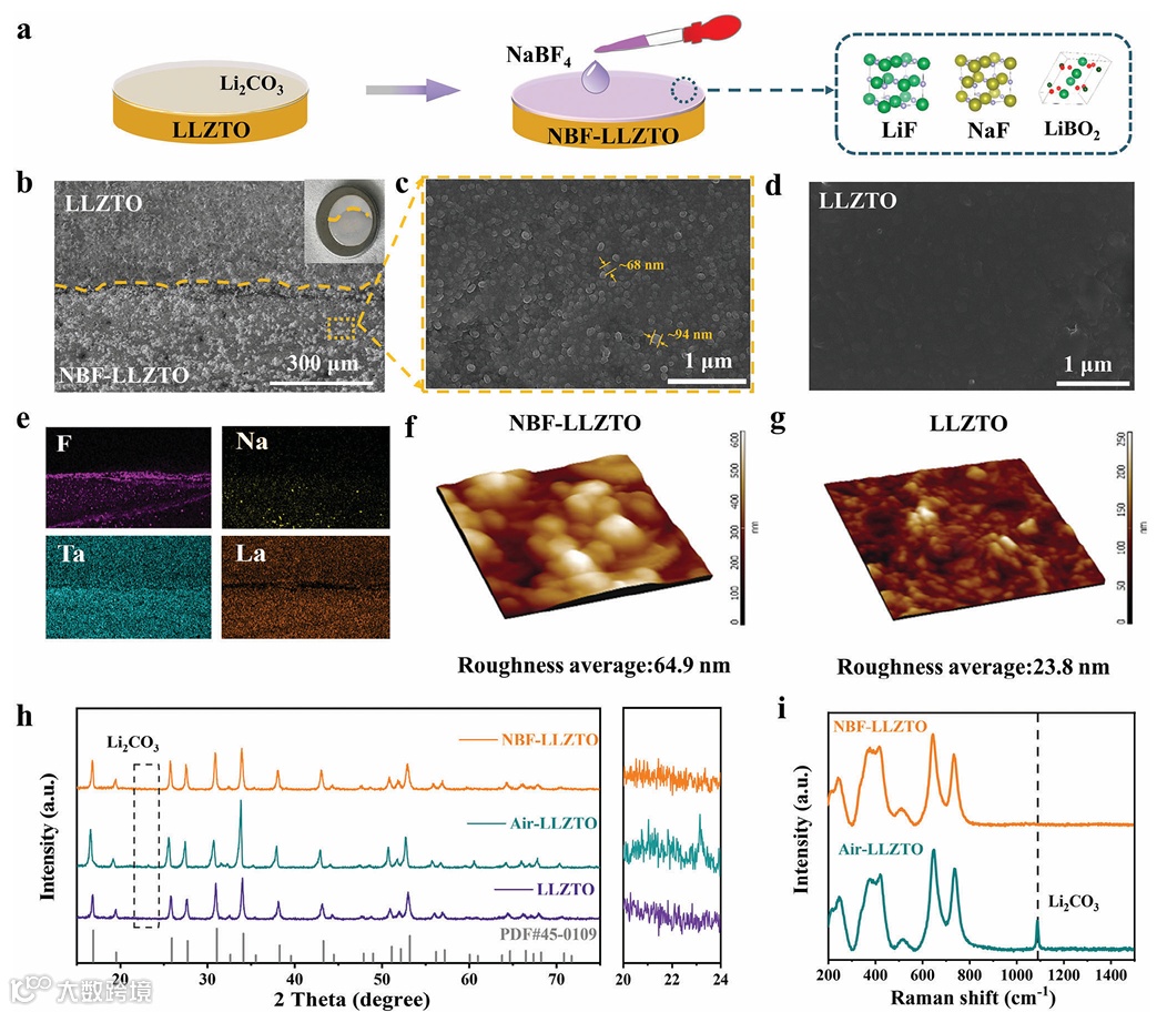 图2. LLZTO和NBF-LLZTO界面形貌,包括SEM图像、元素面扫图、AFM、XRD和Raman光谱。