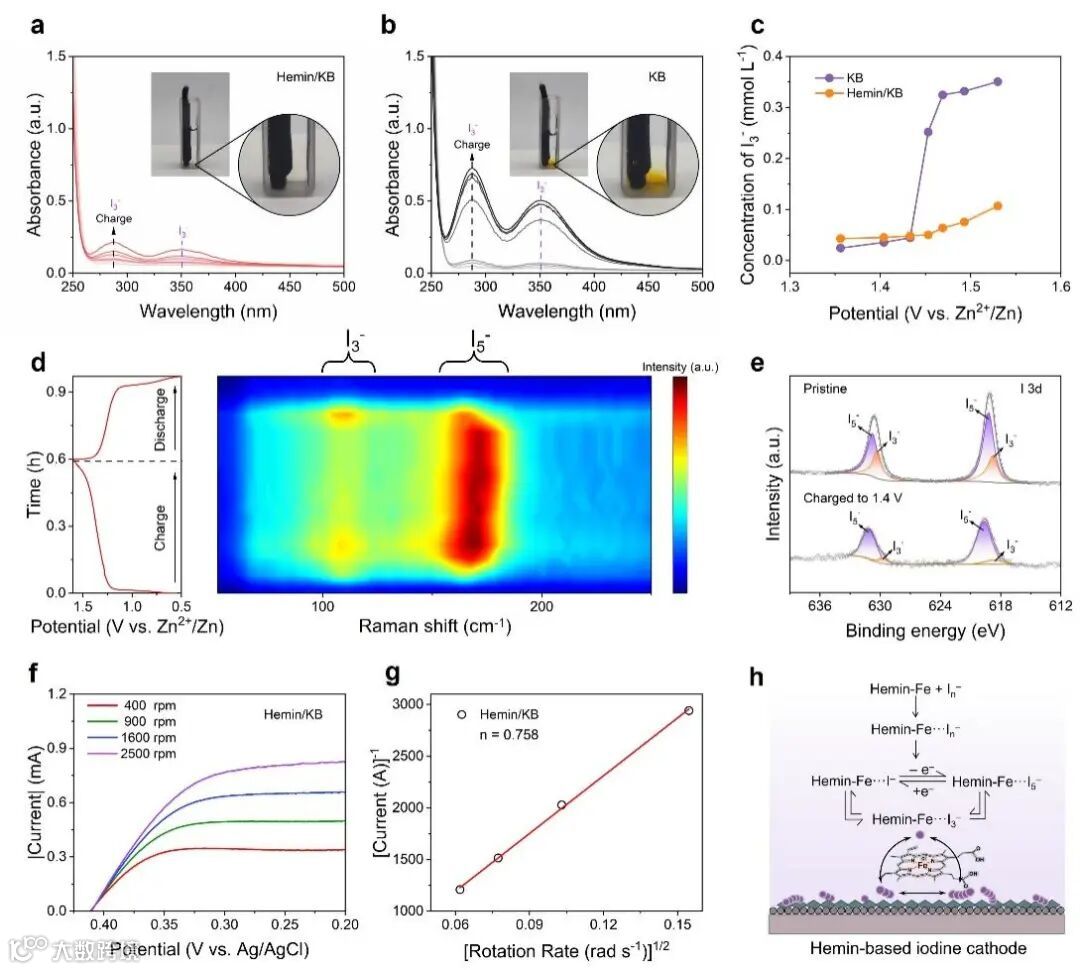 (a)使用(a)Hemin/KB和(b)KB正极充电过程中电解质的原位紫外可见光谱;(c)KB和Hemin/KB 正极电解质中多碘化物浓度的演变;(d)Hemin/KB的Zn−I2电池充电和放电过程中的原位拉曼光谱;(e)Zn−I2电池中Hemin/KB正极的I 3d高分辨率XPS谱图;(f)在含有0.5 mM I2和1 mM I−的溶液中,以不同旋转速率进行碘还原反应的氯化血红素的LSV曲线;(g)图f中转速和电流的拟合曲线;(h)Hemin/KB基正极的吸附和转化机制。
