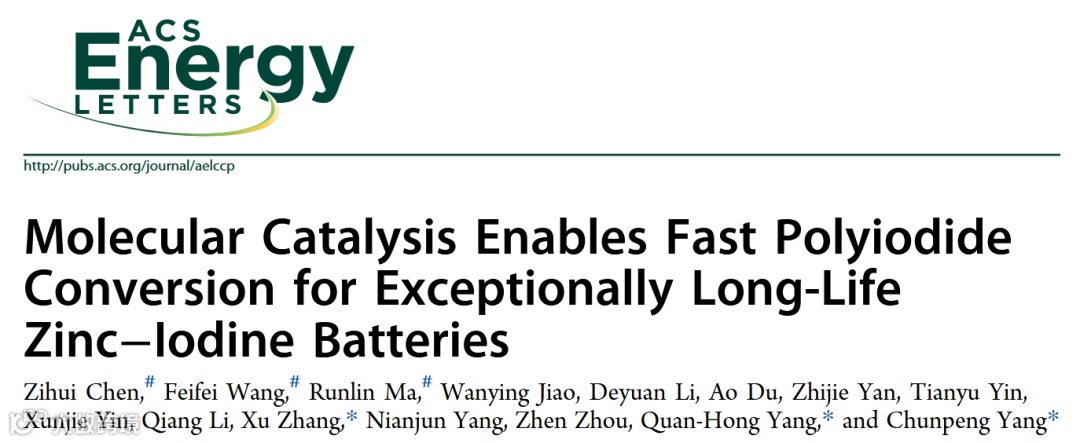 Chen, Z.; Wang, F.; Ma, R.; Jiao, W.; Li, D.; Du, A.; Yan, Z.; Yin, T.; Yin, X.; Li, Q.; Zhang, X.*; Yang, N.; Zhou, Z.; Yang, Q.-H.*; Yang, C.*, Molecular Catalysis Enables Fast Polyiodide Conversion for Exceptionally Long-Life Zinc–Iodine Batteries. ACS Energy Lett. 2024, 9, 2858.