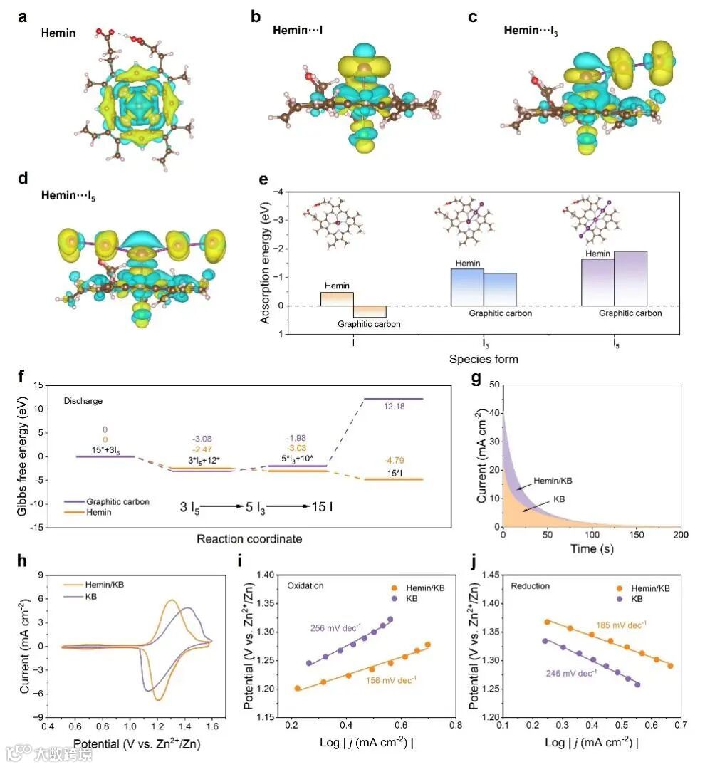 (a−d)碘物种与血红素相互作用后,(a)血红素和(b−d)碘物种优化结构的差分电荷密度。浅蓝色和黄色表示电荷耗尽和积累。等值面值为0.008 eÅ−3;(e)碘物种在血红素和石墨炭上的吸附能计算;(f)血红素和石墨碳的I3−还原反应的Gibbs自由能图;(g)1.2V下I5−溶液的恒电位放电曲线。紫色(Hemin/KB)和橙色(KB)部分的面积表示正极上还原的I5−的量;(h)加或不加血红素的Zn−I2电池在1 mV S−1下的循环伏安曲线;(i, j)含或不含血红素的Zn−I2电池(i)氧化和(j)还原过程的Tafel图。