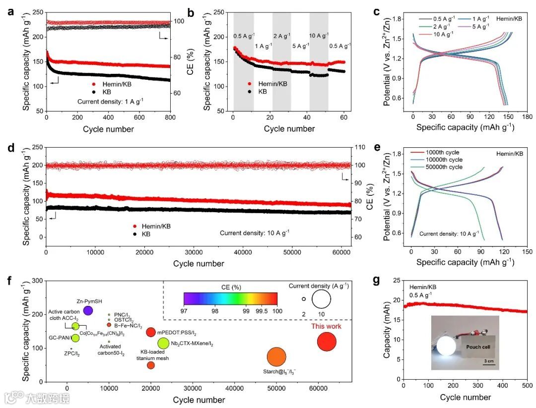(a)采用KB和Hemin/KB正极的Zn−I2电池在1 A g-1下的循环稳定性;(b)采用KB和Hemin/KB正极的Zn−I2电池的倍率性能和(c)相应的充电放电曲线;(d)采用KB和Hemin/KB正极的Zn−I2电池在10 A g-1下的循环稳定性和CE和(e)相应的充电放电曲线;(f)本文Zn−I2电池性能与文献中的电池性能比较;(g)Zn−I2软包电池的循环稳定性及其为LED灯泡供电的照片。