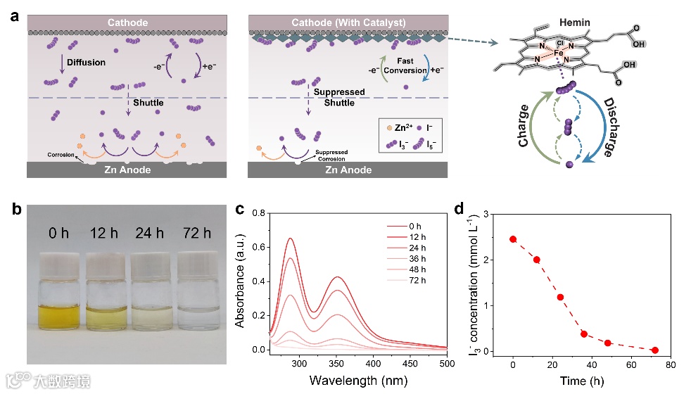 (a)不含(左)和有血红素催化剂(中)的Zn−I2电池示意图,以及Zn−I2电池中血红素捕获和催化碘物种转化的反应途径(右);(b)血红素在不同时间点的吸附情况;(c)UV−Vis光谱和(d)不同时间点多碘溶液的浓度。