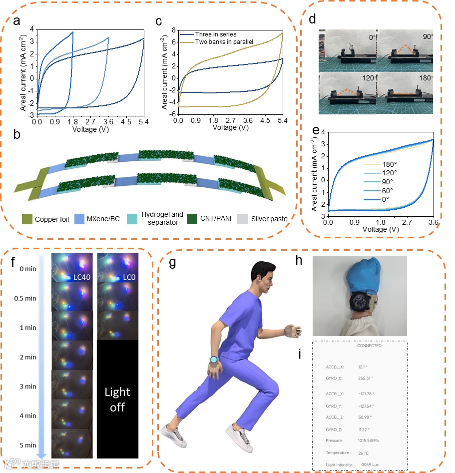 即使在弯曲条件下,该柔性SC也应始终提供稳定的储能性能。两个0.5 × 1.0 cm−2的SCs足以点亮由9个led组成的灯串,保持照明超过5分钟。在开放条件下放置15小时(25°C和50% RH)后, LC40 SC供电时间不受影响,光强度几乎保持不变。为了进一步展示其在可穿戴电子产品中的应用潜力,将柔性SC不用封装就缠绕在手腕上,为传感器供电。该传感器可以记录加速度、角速度、环境温度、大气压力、亮度等各种数据,并通过蓝牙进一步传输到手机。这些演示有效地强调了全方位SC的扩展电压范围,更高的能量密度,固有的灵活性和稳定性,从而为其在动态耐磨条件下的应用奠定了坚实的基础。