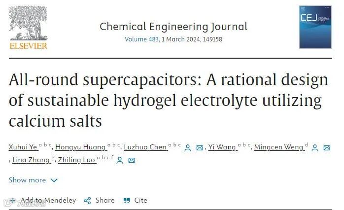 Xuhui Ye, Hongyu Huang, Luzhuo Chen*, Yi Wang, Mingcen Weng*, Lina Zhang, Zhiling Luo*. All-round supercapacitors: A rational design of sustainable hydrogel electrolyte utilizing calcium salts. Chemical Engineering Journal 2024, 483, 149158.