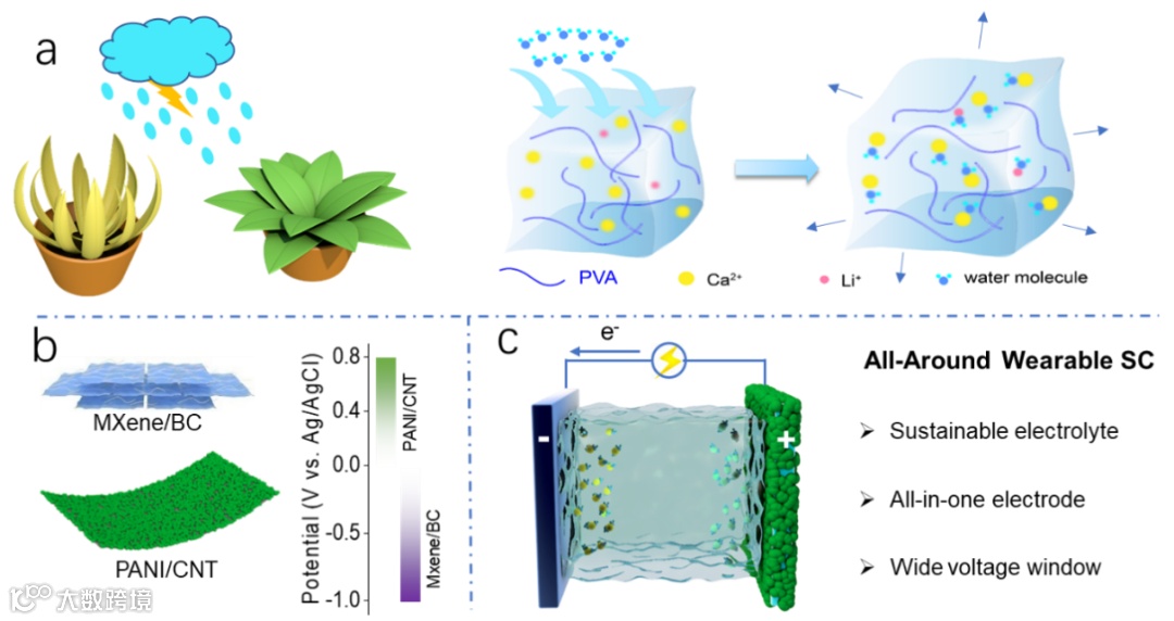 图1 (a)与Anastatica hierochuntica类似,可持续水凝胶电解质能够从空气中吸收水分; (b) MXene/BC和PANI/CNT电极在可持续水凝胶电解质中的电压窗; (c)基于可持续水凝胶电解质的全方位可穿戴SC。