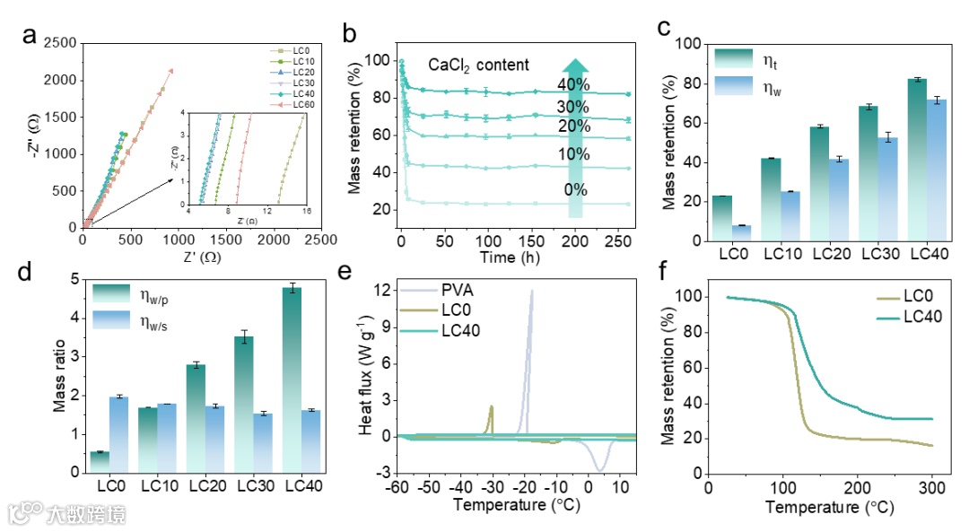 图2 (a)水凝胶的奈奎斯特图; (b) 25℃、50% RH条件下水凝胶的质量变化; (c)水凝胶在最后阶段的质量保留和水保留; (d)最后阶段水凝胶的水与聚乙烯醇和水与盐的质量比; (e)纯PVA、LC0和LC40水凝胶的DSC曲线; (f) LC0和LC40水凝胶的TG曲线。