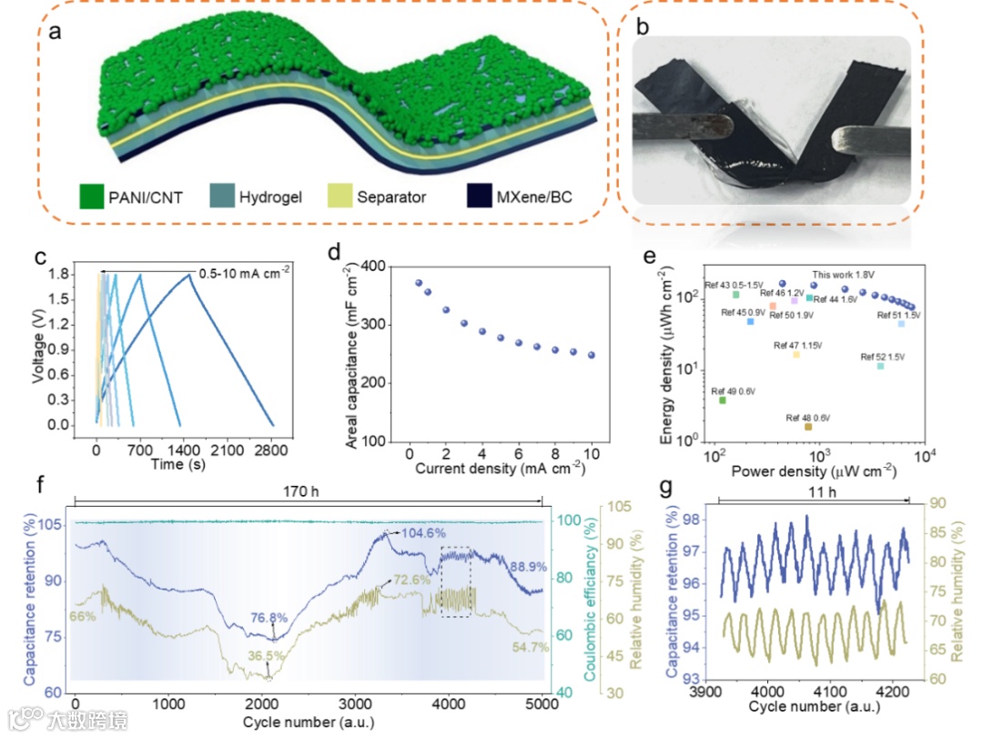 图3 (a)全面SC的示意图;(b)扭曲状态下的全方位SC数码照片;(c)不同电流密度下全方位SC的GCD曲线;(d)全方位SC的面电容;(e)全方位SC的Ragone图;(f)在记录湿度的开放条件下循环时,全能SC的电容保持率和库仑效率。(g)图3f中虚线框表示的3925 - 4225个周期。