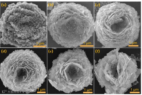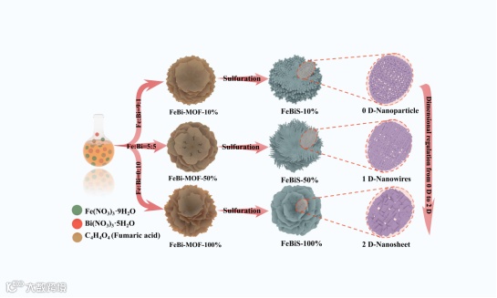 图1:一系列三层花状结构的合成过程,以及基本结构单元在Fe:Bi比例调节下从0D到2D的尺寸演化过程。