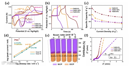 图5:(a) 20 mV s-1下FeBiS-0%、FeBiS-50%和FeBiS-100%的CV曲线;(b) 2 A g-1作用下FeBiS-0%、FeBiS-50%和FeBiS-100%的GCD曲线;(c)不同电流密度下FeBiS-0%、FeBiS-50%和FeBiS-100%的比容量曲线;(d)对应FeBiS-50%的对数(i) vs对数(v)拟合线;(e)不同扫描速率下FeBiS-50%表面电容过程对扩散控制过程的贡献率;(f) FeBiS-0%、FeBiS-50%和FeBiS-100%的阻抗谱。
