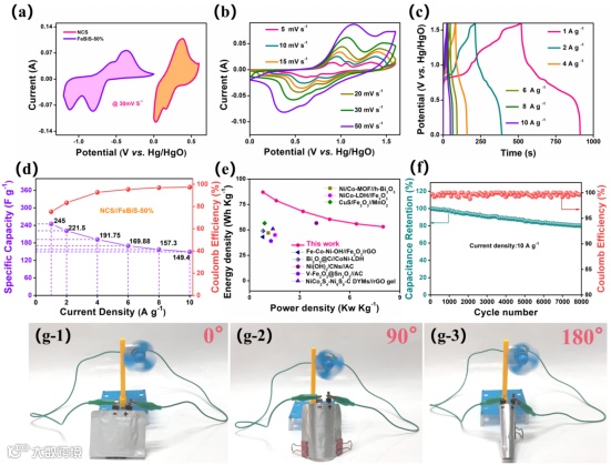 图6:(a)扫描速率为30 mV s-1时FeBiS-50%和NCS电极的CV曲线。(b)不同扫描速率下NCS//FeBiS-50% HSC装置的CV曲线。(c)不同电流密度下HSC器件的GCD曲线。(d)不同电流密度下HSC的比电容和库仑效率。(e) HSC的Ragone图。(f) HSC在10 A g-1时的循环稳定性和库仑效率。(g)不同弯曲度(0度、90度、180度)的HSC装置为风扇供电的照片。